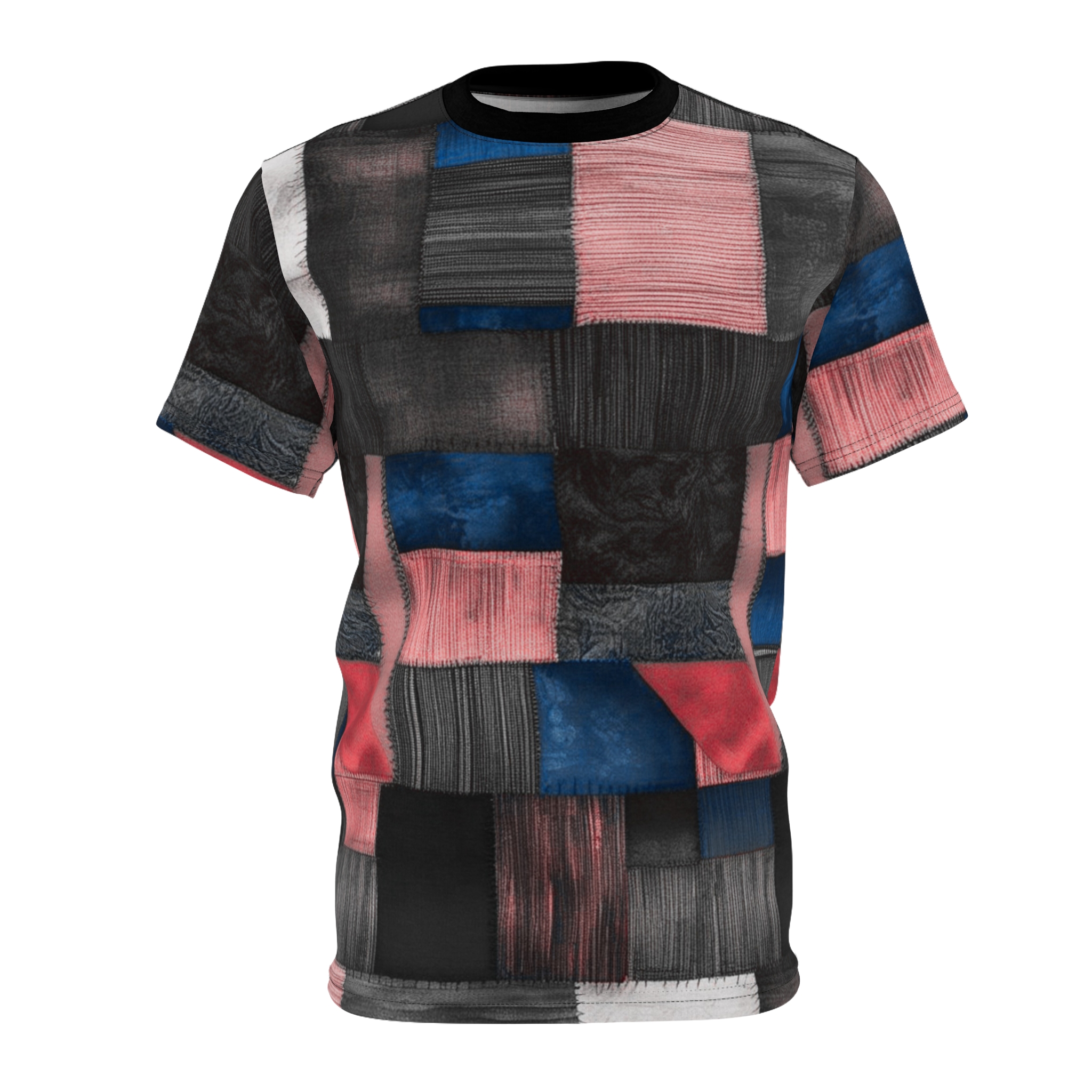 Graphic Print Tee, Fabric Patches Unisex T-Shirt, All Over Print Patchwork Shirt, Unique Sewn Design Top, Quirky Patch Tee